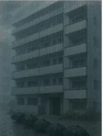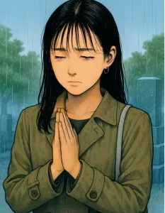 彼女のグレーのレインコートは湿気を吸い、肩口には雨染みがじっとりと浮かんでいる。