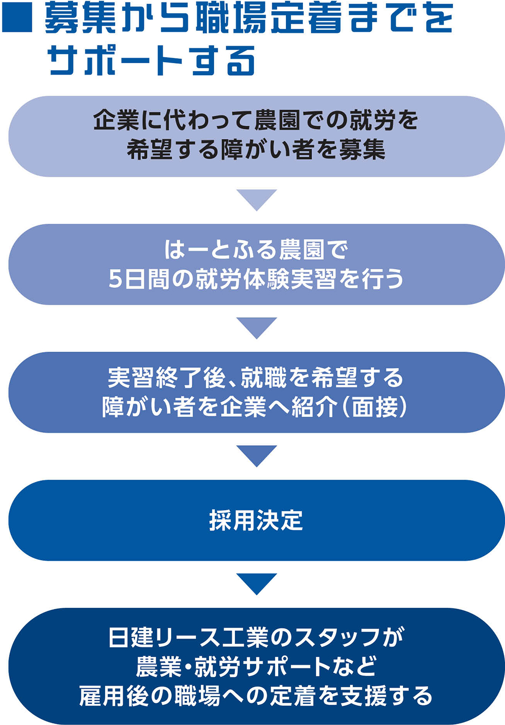 障がいのある人が安心して長く働き続けるためには、「自分は社会に必要とされている」「日々、成長できている」と実感できる職場環境が欠かせない。その理想を形にしたのが、仮設資材レンタルのリーディングカンパニー・日建リース工業が2018年に始めた「はーとふる農園」だ。この農作業を通じた就労支援は、同社が掲げる「レンタルを通して大いなる社会貢献と幸せの創造」という理念を形にしたものである。