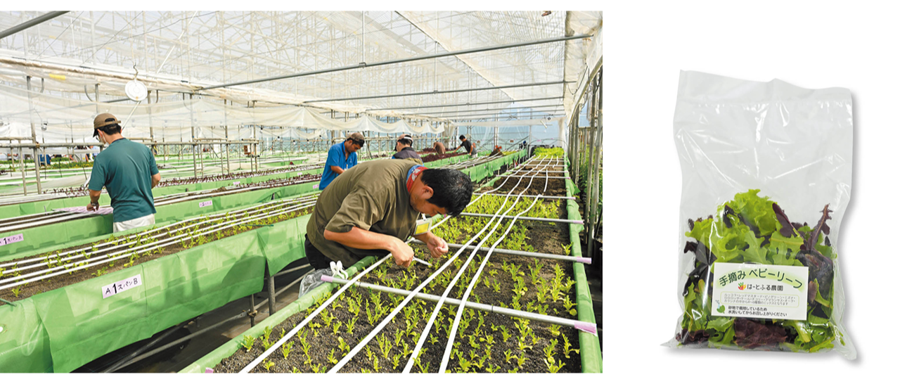 写真右 栽培しているのは主にベビーリーフ。手摘みで葉の形が美しく保たれており、その品質がスーパーやレストランで高く評価され、作業者の自信にもつながっている